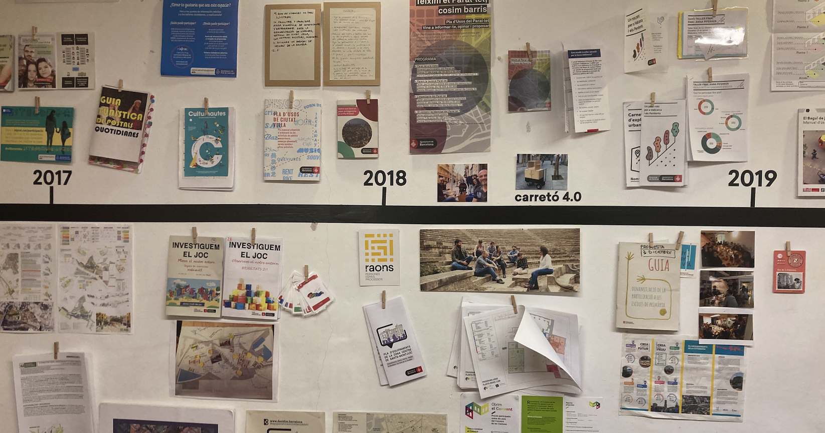 Amb l’impuls d’aquell moment vam començar a experimentar en l’entorn d’un solar en desús al barri de Fort Pienc, treballant sobre una diagnosi del barri. Durant aquella experiència vam impulsar dinàmiques participatives innovadores, proposant i millorant jocs i eines per apropar-nos a la ciutadania, i poder conversar i conèixer les seves necessitats com a persones usuàries de l’espai públic. El què va començar com un conjunt d’idees, al llarg del temps s’ha anat configurant en una metodologia definida. Entre algunes de les eines emprades, destaquem el punt d’interacció mòbil, que als inicis anomenàvem “carretó”, i un joc de cromos del barri; aquestes eines han anat evolucionat durant els anys, i han estat adoptades per algunes administracions públiques i entitats.